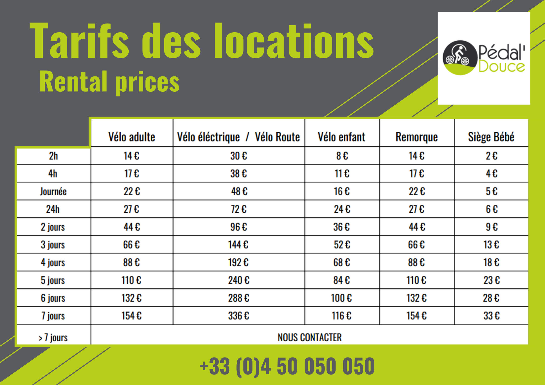 matériel dans les conditions visées aux articles concernés.Il est expressément convenu que le montant du dépôt de garantie ne saurait en aucun cas constituer une limite de garantie, le loueur conservant, le cas échéant, le droit de poursuivre le locataire à l’effet d’obtenir l’entier dédommagement de son préjudice.Conditions d'utilisation :Pour sa propre sécurité et celle des autres, le locataire reconnaît avoir l’expérience de la pratique du 2 roues que ce soit en ville comme en campagne.Dès que le locataire entre en possession du vélo cycle, il en devient le seul garde juridique et de ce fait il s’engage à l’utiliser avec soins et à respecter en tous points la règlementation en vigueur, le code de la route ainsi que les conditions d’utilisation des divers accessoires. Il demeurera en conséquence seul responsable des amendes, contraventions, procès-verbaux établis contre lui.Le locataire s'engage à ne laisser utiliser le vélo cycle par d'autres personnes que lui-même ou celle agréée par le loueur et dont il se porte garant. Il s'engage d'autre part à ne l'utiliser que pour ses besoins personnels et s'interdit de participer à toutes compétitions ainsi qu'à leur essai ou préparation.Tout usage du matériel à des fins autres que celles auxquelles il est destiné par le constructeur est interdit.Le locataire s’interdit d'effectuer des modifications ou transformations sur le vélo cycle.Les mineurs (moins de 18 ans) ne sont habilités à louer un vélo cycle qu'avec la contre-signature de leur représentant légal.Le locataire s’engage à ne pas sous-louer le matériel loué et de manière générale à ne consentir aucun droit, réel ou autre, au profit de quiconque susceptible d’en affecter la jouissance ou d’en limiter la disponibilité ou la pleine propriété du loueur.Responsabilité / Assurance :Le locataire dégage la société PEDALE DOUCE SARL de toute responsabilité découlant de l’utilisation du matériel loué notamment en ce qui concerne les accidents ou dommages corporels, matériels ou immatériels qu’il pourrait causer aux tiers ou à lui-même. Le locataire déclare à ce titre être titulaire d’une assurance personnelle en responsabilité civile.Panne / Accident :En cas de panne ou d’incident durant la location, le locataire s’engage à mettre tout en œuvre pour procéder aux premières réparations avec le kit fournis par le loueur afin de pouvoir ramener le matériel au point de location.En cas de panne ou d’accident entrainant l’immobilisation du vélo cycle, le locataire s’engage à prendre contact téléphoniquement avec le loueur qui lui indiquera les mesures à prendre.Le locataire s'interdit formellement d'abandonner le vélo cycle sans en avoir obtenu l'accord du loueur. En cas de dépannage sur place le loueur se réserve la faculté d’appliquer une facturation complémentaire au locataire.Perte / Vol / Dégradations :Le locataire ne bénéficie d’aucune couverture pour les dommages, dégradations, perte ou vol subis par le matériel loué. Le locataire s'engage à en avertir immédiatement et sans délai le loueur.En cas de perte ou de vol, le loueur encaissera le montant total du dépôt de garantie en dédommagement. En cas de vol, le locataire devra en outre présenter au loueur la déclaration de vol établie auprès des services de police.En cas de dégradation du matériel, le locataire prendra à sa charge le coût de la remise en état dudit matériel, lequel pourra être retenu sur le dépôt de garantie. En cas de faute grave caractérisée (défaut de maitrise pour conduite en état d’ivresse ou vitesse excessive), le loueur pourra réclamer outre le coût des réparations une indemnité d’immobilisation du vélo cycle correspondant au tarif journalier en vigueur dans un maximum de 10 jours.Règlement des litiges :En cas de contestation quelconque relative à l'exécution, l'interprétation ou la résiliation du présent contrat, le litige sera réglé ainsi qu’il suit :Réclamation : Toute réclamation doit être adressée au siège de la société LOUEUR, 2 rue Jean-Jaurès – 74000 ANNECYMédiation : En cas d'échec de la demande de réclamation auprès de la société PEDALE DOUCE SARL ou en l'absence de réponse dans un délai de deux mois, le Locataire peut soumettre le différend l'opposant au loueur à un médiateur, l’association JURIMEDIATION, dont le siège social est à ANNECY (74000), 9 rue Guillaume Fichet (Numéro préfectoral 0741013287/http://www.juri-mediation.fr Tél. 04 50 45 60 80) qui tentera, en toute indépendance et impartialité, de rapprocher les parties en vue d'aboutir à une solution amiable.Les parties au contrat restent libres d'accepter ou de refuser le recours à la médiation ainsi que, en cas de recours à la médiation, d'accepter ou de refuser la solution proposée par le médiateur. La procédure finit par un règlement amiable du médiateur ou d'une autre autorité compétente.A défaut de médiation, le litige pourra être porté devant les juridictions compétentes en la matière.